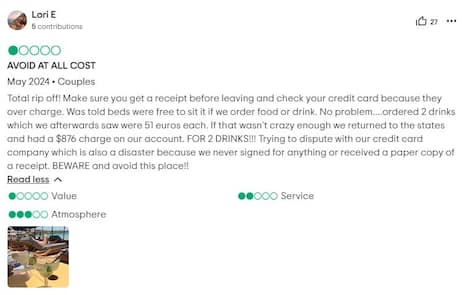 “We ordered two drinks and later found out they cost 51 euros each. As if that wasn't already crazy enough, when we got back to the United States, we noticed that our account had been billed for a total of $876 (American),” wrote Lori, a tourist.