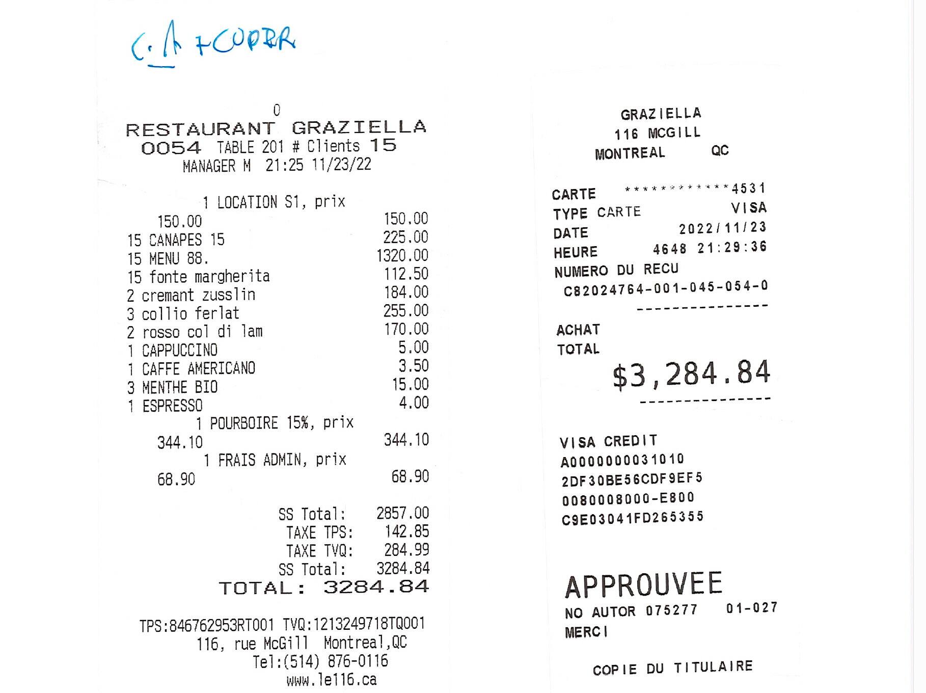 The CEO was a regular at Graziella, a refined Italian restaurant in Old Montreal. In 3 years, he ate there 36 times for a total of $10,900 (including $5,700 in 2022). He also went to Fairmount The Queen Elizabeth 33 times for a total of $3,380.
