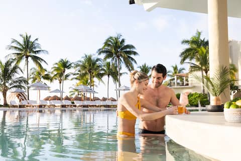 Surrounded by lush mangroves, the quaint horseshoe-shaped hotel evokes a modern hacienda and offers an intimate setting and laid-back vibe that appeals to couples. Most of the 291 rooms overlook a single swimming pool or the ocean, and some have private “swim-up” pools. A good choice for a romantic getaway!