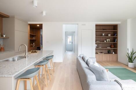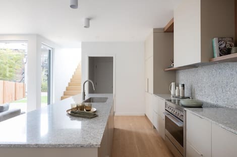 The design magazine-worthy kitchen has two built-in refrigerators, a countertop and a quartz backsplash. It occupies the rear of the house and opens into the living room.
