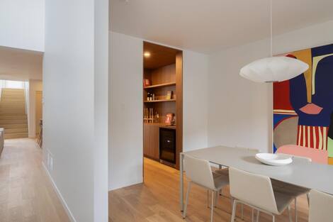 Next, you’ll find a dining room adjacent to the coffee area, as well as a pantry hidden behind a structural door.