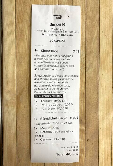 “Hello my little pangolins, I wish you a sunny day in your collective hearts because the outside is as gray as my soul. Be careful if you take bats, I do not have another pandemic emerging from Hello yet! My cocoa, it hurts your reputation. Ask Wuhan ”, is it possible to read in the order form.