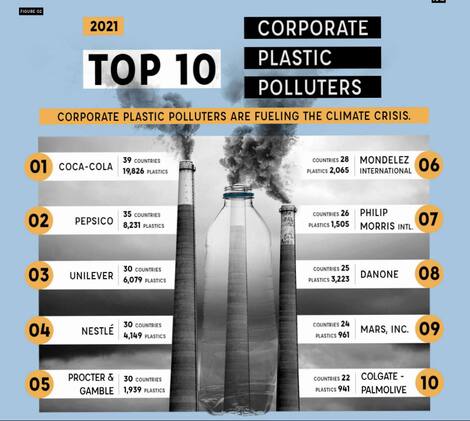 Top 10 companies in plastic pollution in order: Coca-Cola, PepsiCo, Unilever, Nestle, Procter & Gamble, Mondelz International, Philip Morris International, Danone, Mars, Inc. And Colgate-Palmolive.