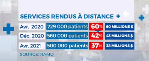 In April 2020, family physicians reached 729,000 patients through teleconsultation. This represents 60% of all visits and a bill of 60 million to the government. By December 2020, the percentage of services provided remotely had dropped to 42 percent. The latest and most available data indicate that this percentage was 37% last April. This can be explained by the fact that some elderly doctors do not get their second dose.