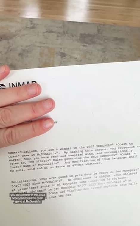 “I won 2023 McDonald’s Monopoly this year. You are probably wondering how much I earn. Hmm… that’s a lot! I’ll show you the check. How many zeros,” she quips.