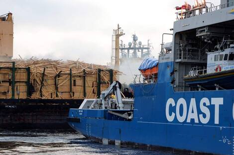 The ship’s captain has so far refused to leave the ship, where Coastguard firefighters are also taking turns.